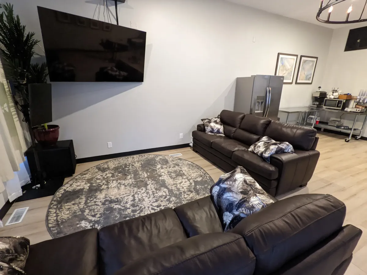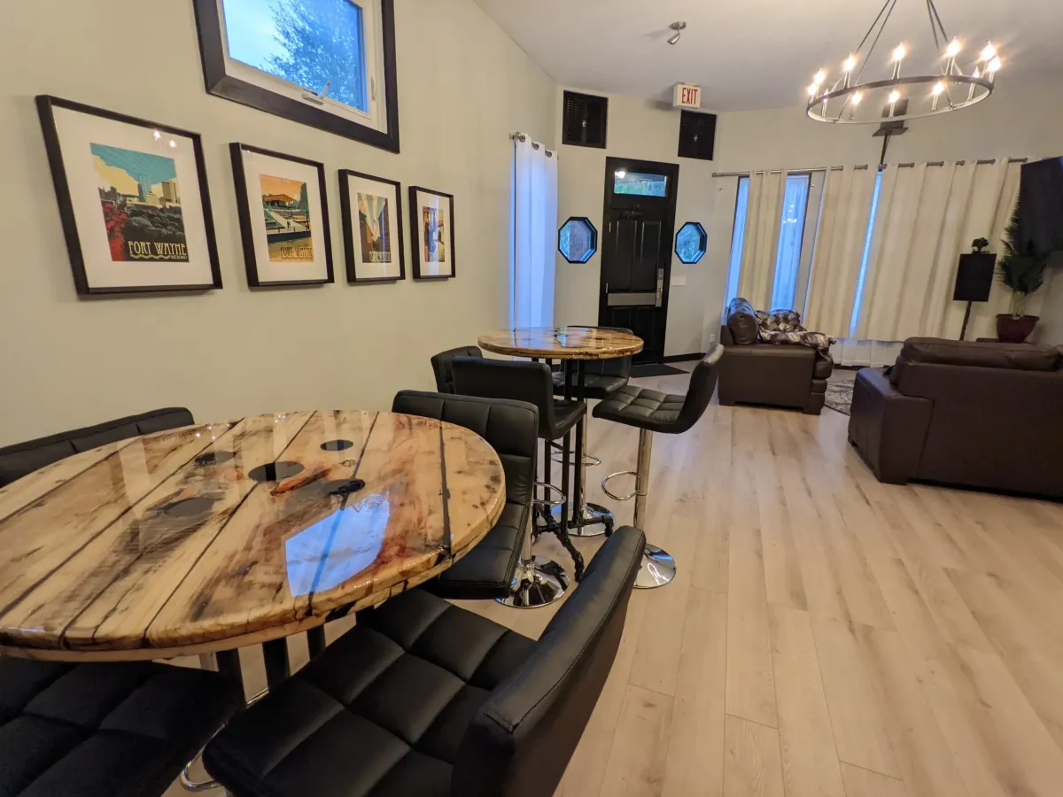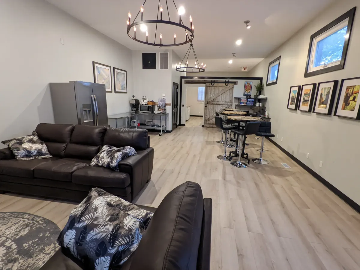 This space also includes couches, bar height tables, and stools. All furniture is easily moved to accommodate various space uses. Stainless steel fridge with ice maker, air fryer, commercial size BUN coffee maker, hot plate, bartender's tools are included as well.